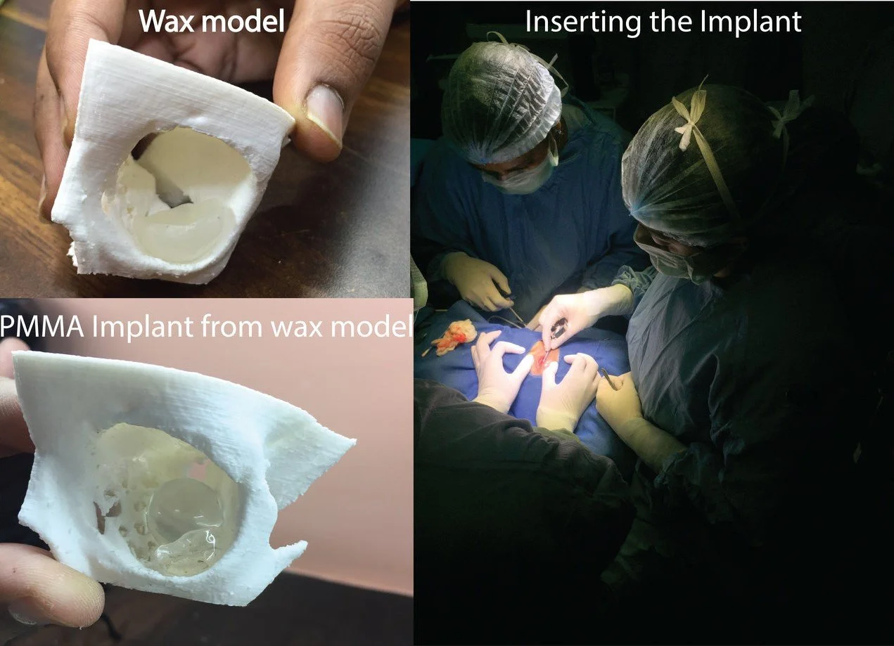 Despite its increasing use in craniofacial reconstructions, three-dimensional (3D) printing of customized orbital implants has not been widely adopted. Limitations include the cost of 3D printers able to print in a biocompatible material suitable for implantation in the orbit and the breadth of available implant materials. We developed a technique of low-cost 3D printing of orbital implants used in complex, often secondary, orbital reconstructions for primary orbital implant migration.