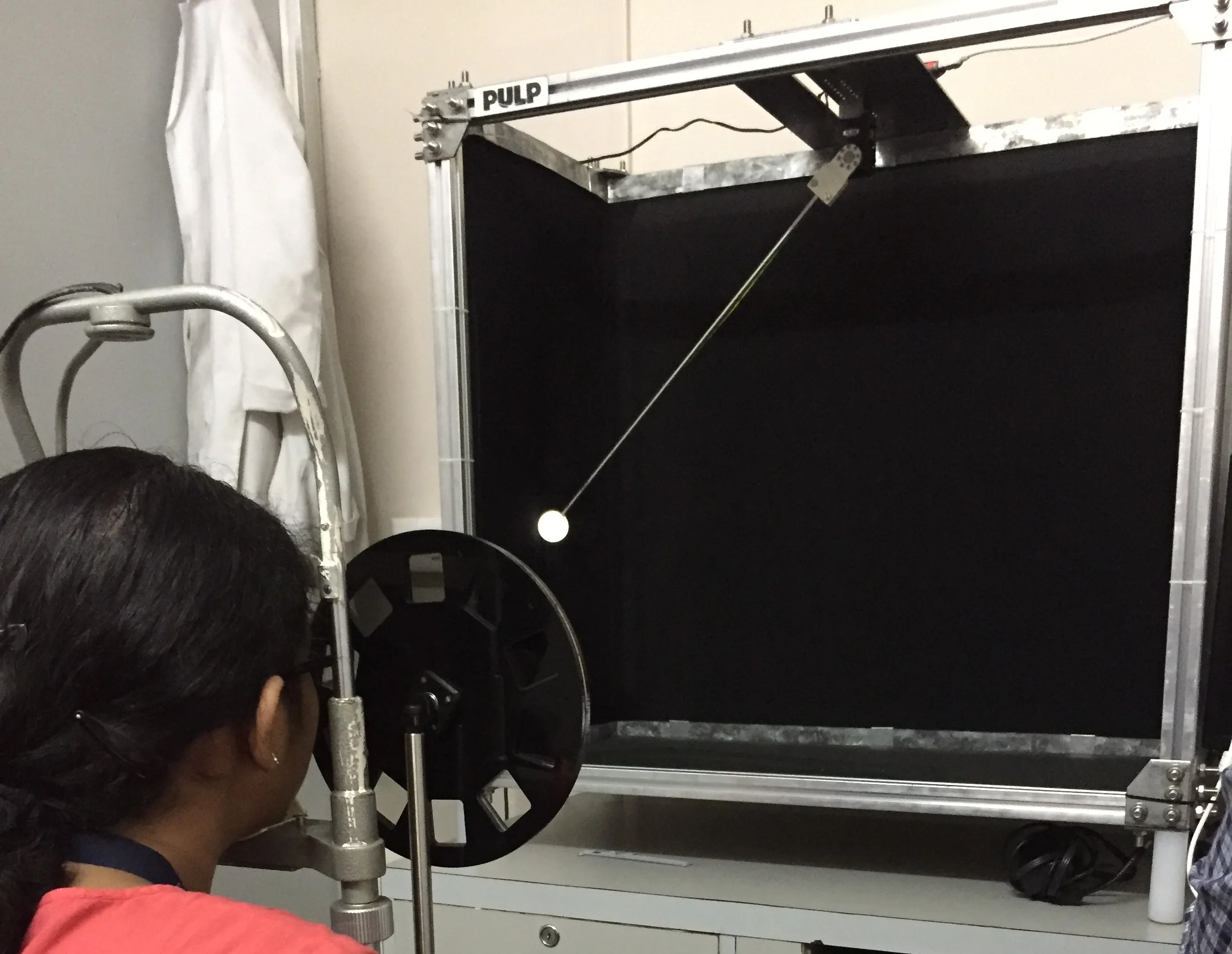 The classical demonstration of the Pulfrich Effect is by a swinging pendulum. The pendulum is swung back and forth; when viewed normally with both eyes, the pendulum just seems to swing back and forth. When a filter is placed in front of one eye, the pendulum suddenly seems to be swinging in an ellipse parallel to the floor. Dimming the light equally to both eyes does not cause the illusion. If the pendulum already is swinging in an ellipse, dimming the light to one eye changes the shape of the ellipse.