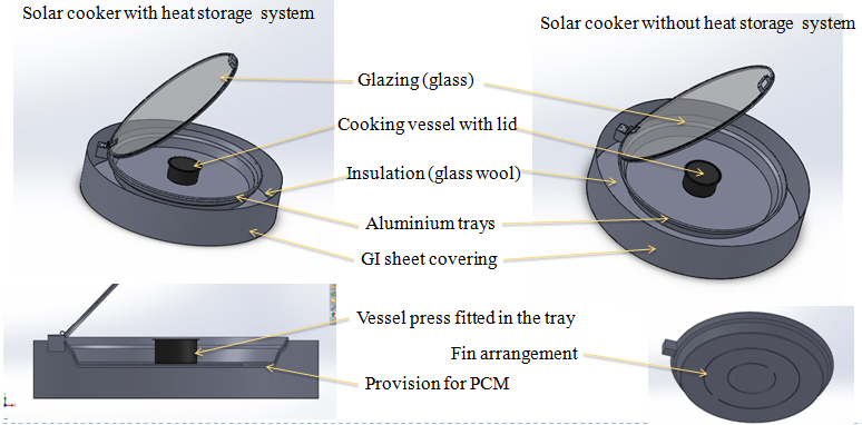 Two solar cookers one without thermal storage system and other one with thermal storage system with identical dimensions are to be designed and fabricated. This design consists of aluminium trays and cooking vessels to cook the food, Paraffin wax is used as the thermal storage system(phase change material), glass wool for insulation, metal sheet as the outer casing, Glass is used as a glazing surface to the cooker. Standard parts have been used for most of the components. The design is simple and made with materials that are easily available in the market.